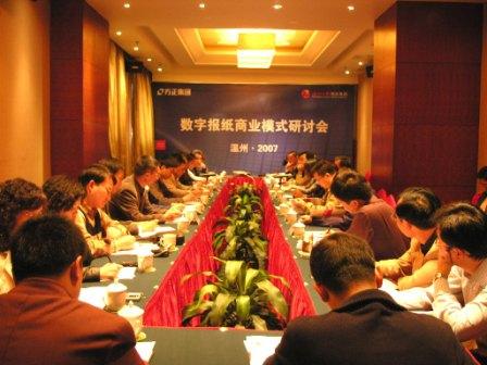 2007年11月11日至13日,由溫州日報報業(yè)集團與方正集團共同舉辦的“數字報紙商業(yè)模式研討會(huì )暨溫州日報報業(yè)集團數字報紙項目鑒定會(huì )”在溫州市舉行。中國報業(yè)協(xié)會(huì )常務(wù)書(shū)記趙連宏、電子技術(shù)工作委員會(huì )主任王振鐸、中國新聞出版總署數字報業(yè)實(shí)驗室秘書(shū)長(cháng)馮玉明等領(lǐng)導,與來(lái)自人民日報、廣州日報報業(yè)集團、解放日報報業(yè)集團、文匯新民聯(lián)合報業(yè)集團、新華日報報業(yè)集團、福建日報報業(yè)集團、羊城晚報報業(yè)集團、杭州日報報業(yè)集團、長(cháng)江日報報業(yè)集團等報業(yè)專(zhuān)家代表50多人出席了本次會(huì )議。