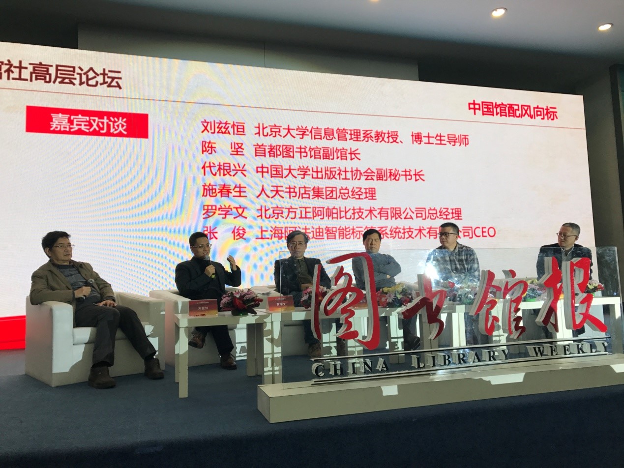 2018年1月11日,由北京圖書(shū)訂貨會(huì )組委會(huì )、中國出版集團公司、新華書(shū)店總店主辦,《圖書(shū)館報》、中國圖書(shū)館學(xué)會(huì )與閱讀出版委員會(huì )、北京方正阿帕比技術(shù)有限公司承辦的“2018全國館社高層論壇”(以下簡(jiǎn)稱(chēng)“論壇”)在北京國際展覽中心舉行,來(lái)自出版、館配和圖情界的全國300余位代表參加了會(huì )議。
